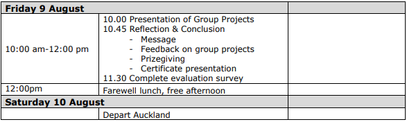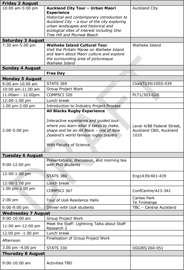 本项目为期两周,共计安排约12个小时的专业课程学习,学习课程包括数学和计算机离散结构、统计理论、算法与数据结构、人工智能等(详见日程安排)。参与项目的学生将以小组为单位,通过PBL课题研究的创新型学习方式,拓展对专业课程的实践认知,小组合作完成课题项目并最终进行展示,外方将对各组项目进行评选并颁奖。参与项目的学生会获得由奥克兰大学颁发的证书和成绩单。