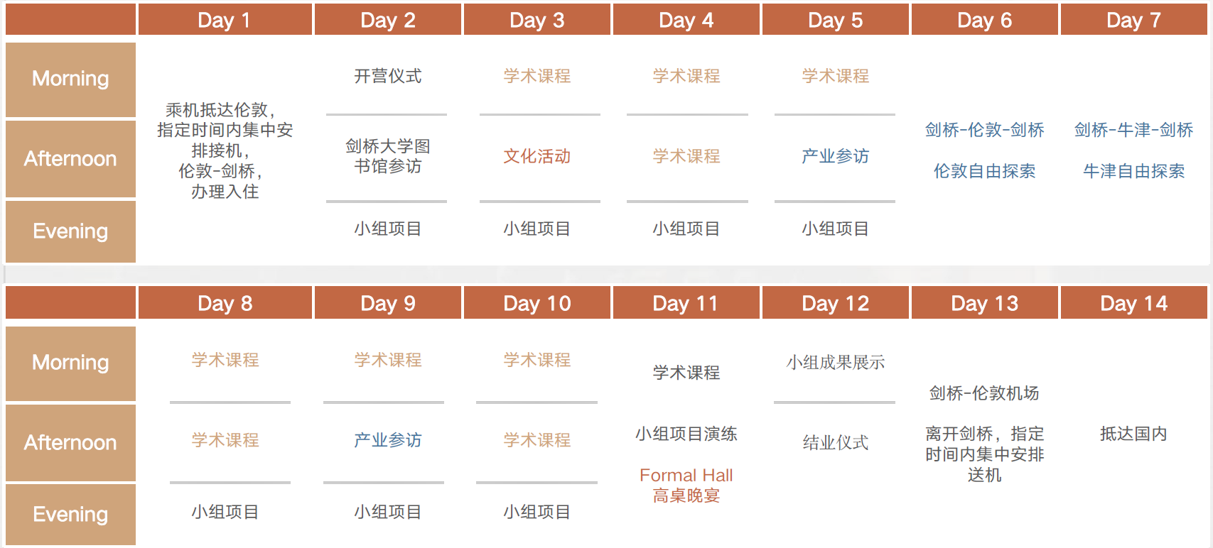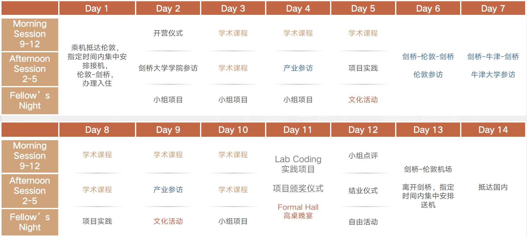 本项目包含课程学习、参访与活动、文化活动三个木块,均将在剑桥大学沃尔森学院(Wolfson College)和剑桥大学麦格达伦学院(Magdalene College)举办。共有4个主题: